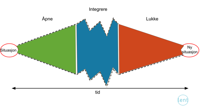 I kreative prosesser uten forutbestemte svar, opererer vi gjerne med tre forskjellige faser: Åpne opp, integrere, og lukke ned(Kaner og Lind 1996). Prosesser kan gjennomgå denne syklusen en eller flere ganger. Modellen viser hvordan prosesser ofte har en slags rytme som følger logikken i åpne-integrere-lukke modellen. Som i alle modeller er dette en forenkling av virkeligheten, men den er nyttig for å forstå hvorfor ulik dynamikk og energi ofte oppstår underveis i en prosess. Som fasilitator (https://www.lent.no/sporsmal-og-svar/prosessledelse/hva-er-forskjellen-pa-fasilitering-og-prosessledelse/) eller prosessleder (http://www.prosesslederstudiet.no/) kan det hjelpe deg å vite hvilken fase du befinner deg i, slik at du kan forberede deg på hvordan du kan lede deltakerne hensiktsmessig gjennom de ulike fasene. Når det er sagt, vil fasene ofte gli litt over i hverandre.